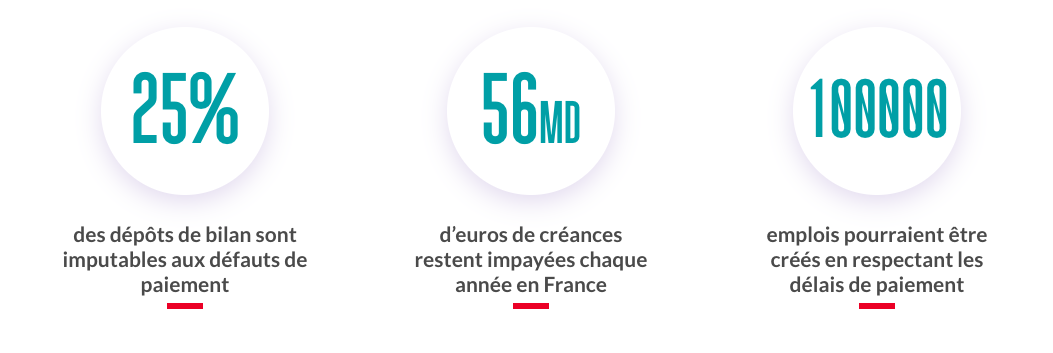 Le montant total des créances impayées en France est de 56 milliards d’euros !!! Cela représente 2% du PIB… et sur les 58.000 défaillance d’entreprise constatées l’an dernier, environ 15 000 sont liées à des retards de paiements.